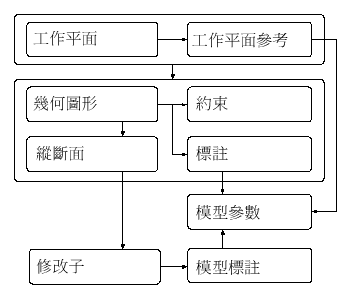 下圖展示了構成模型的圖徵。箭頭表示圖徵之間關係的方向。例如,修改幾何圖形會影響縱斷面,而縱斷面又會影響修改子,依此類推。在您進一步瞭解每個圖徵時,請參考此圖,以幫助您瞭解圖徵之間的關係。