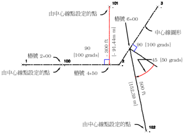 點 100 位於樁號 200 處,偏移為零。點 101 位於樁號 450 處,向左偏移距離為 91.44。點 102 位於樁號 600 處,向右偏移距離為 152.4 且斜交角為 50。