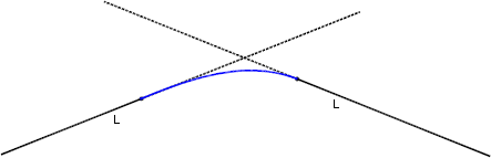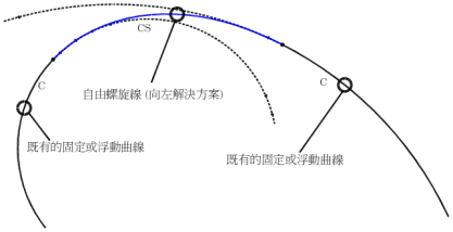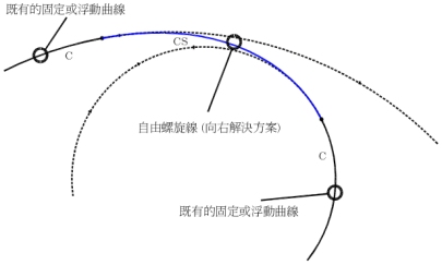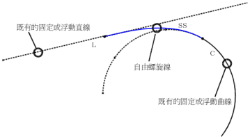 在您要螺旋線與其所貼附至的直線保持相切的情況下,於兩條直線之間加入自由螺旋線。對於此解決方案,螺旋線為簡單螺旋線、內曲螺旋線或外曲螺旋線。