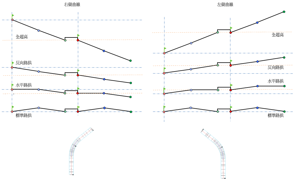 「保持中央造型」意味著當套用超高時,中央將會升高以容納超高。此選項會保持中央造型,而 樞軸點會升高或降低。