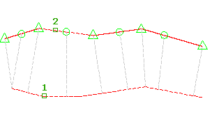 將沿地勢線和投影至參考地勢線的黃線上要編輯的每個點處顯示圖像,這些圖像會顯示每個點之參考高程的位置。