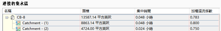 顯示每個集水區的集中時間,以及所有連接集水區的最長集中時間。