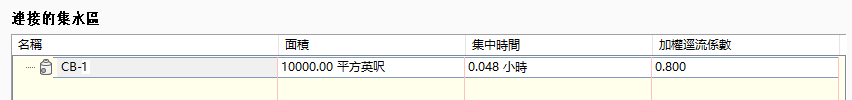 如果沒有任何集水區連接到該結構,您可直接在「面積」、「集中時間」和「加權逕流係數」欄位中,輸入集水區值。