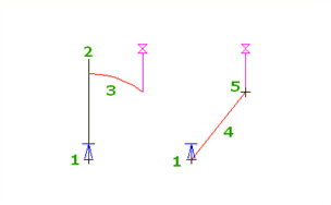 會使用最後輸入的點,否則您必須指定一個目前點。經由起點 (1) 和北子午線 (2) 指定方位角 (3) 和距離 (4),以指定點 (5)。