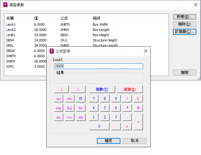 - 按兩下模型參數 (例如 LenB1) 的「公式」欄值,您可以輸入值或公式,以指定零件的長度。