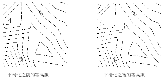 地形平滑化使用 NNI 平滑法或 Kriging 平滑法在系統確定的高程處加入點,從而得到無重疊的平滑等高線。