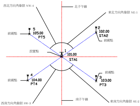 方向的格式可以設定為方向角或方位角,並且必須從既有控制點到另一個點 (假想點或其他控制點) 定義。