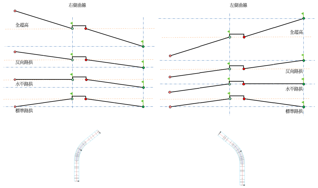 「保持中央造型」意味著當套用超高時,中央將會升高以容納超高。此選項會保持中央造型,而 樞軸點會升高或降低。