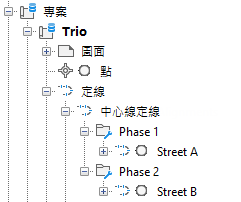 您可以使用 Autodesk Vault 將專案物件組織到子資料夾內。子資料夾若包含專案物件,則顯示在「探勘器」中。以下插圖在「探勘器」中展示了兩個專案定線子資料夾 (存在於「中心線定線」資料夾內)。
