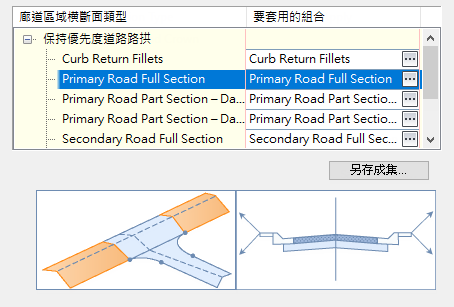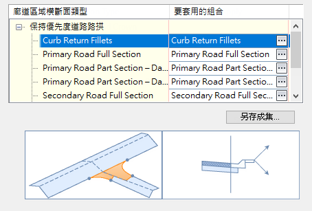 同樣地,若您正使用「交叉路緣圓角參數」對話方塊編輯交叉路緣圓角參數,每當您在此對話方塊中選取區域或路緣圓角時,被選取的區域或路緣圓角會在圖面中亮顯。