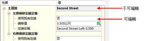 不可編輯性質的描影:在編輯對話方塊中,不可編輯的性質會以灰色 (描影) 背景顏色顯示。可編輯的性質會以白色 (無描影) 背景顏色顯示。