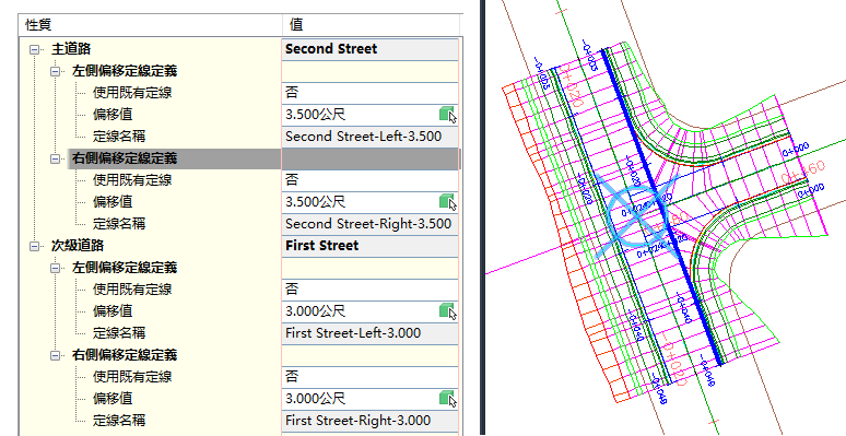 如左側所示,在「交叉偏移參數」對話方塊中選取了右側偏移定線。該偏移定線在圖面中亮顯。
