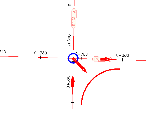 以下插圖展示了沿著指出進入交通和離開交通方向之定線上的暫時箭頭。這些箭頭會在您指定交叉路緣圓角參數時顯示。