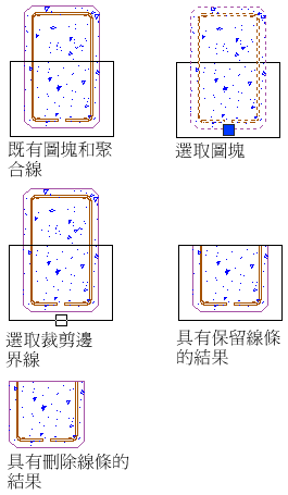 將刪除所有位於裁剪邊界以外之最初選取的線條。如果您選擇刪除裁剪邊界,將重繪所有裁剪區域內的封閉邊界圖元的邊界。但是所有已裁剪的開放邊界物件將保持開放狀態。