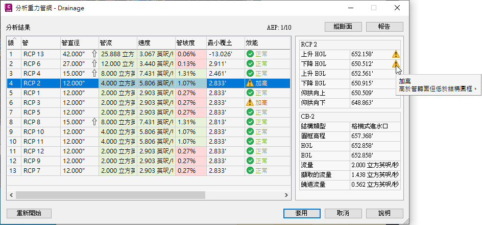 您可以使用「分析重力管網」指令來調整管的大小和重置抑拱,並根據 HEC-22 標準計算能量和水力梯度線。
