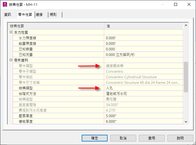 您可以將「零件建置器」建立的零件參數,對映至「分析重力管網」指令所需的參數。