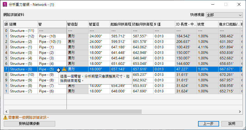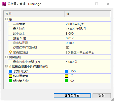 將參數對映並套用至既有管網中的結構後,使用「分析重力管網」指令時,就不需手動指定值。