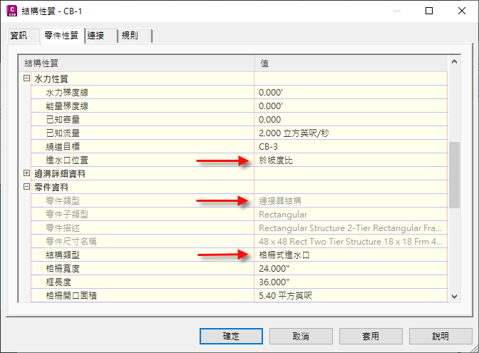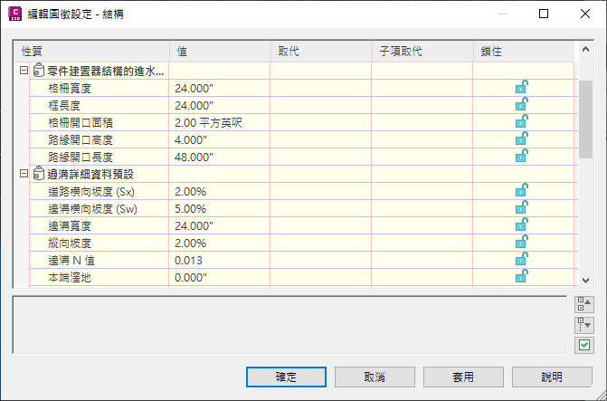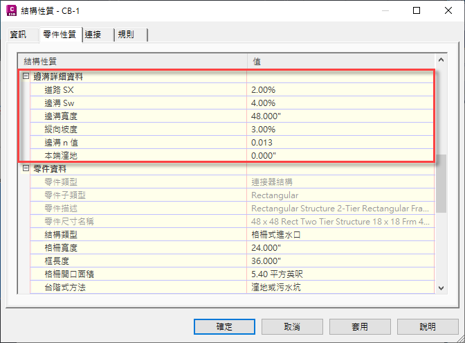 您可以使用「結構性質」對話方塊的「邊溝詳細資料」區段,來定義進水口周圍道路區域的性質。「分析重力管網」指令會將這些性質用於計算進水口分析。