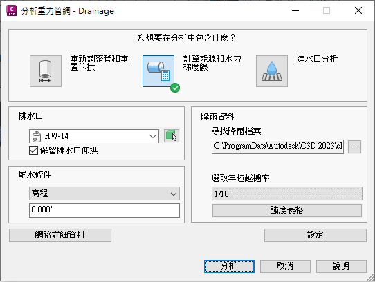 您可以選取三種分析類型:「調整管大小和重置仰拱」、「計算能量和水力梯度線」及「進水口分析」。