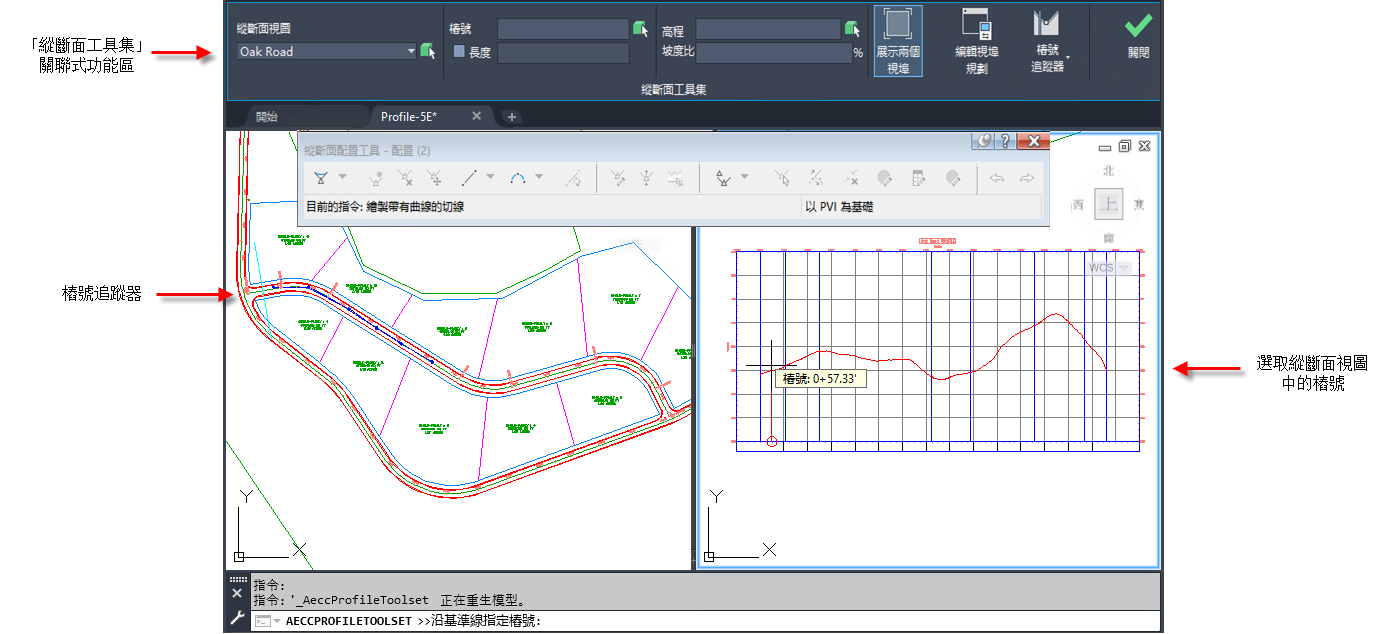 按一下「透通」功能區上的「縱斷面工具集」按鈕後,即會顯示「縱斷面工具集」頁籤。