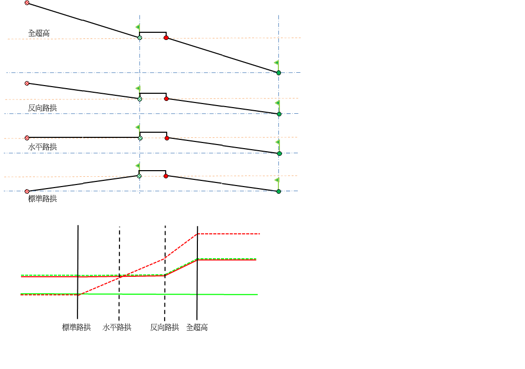 「保持中央造型」意味著當套用超高時,中央將會升高以容納超高。此選項會保持中央造型,而 樞軸點會升高或降低。