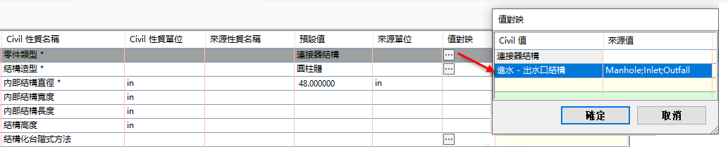 以下範例會示範如何使用「值對映」對話方塊來對映「Structure_type」屬性的來源值,以便將來源值引入至 Civil 3D 做為「連接器」結構。