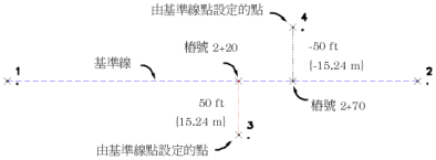 點 3 在樁號 2+20 處從基準線向右偏移了 15.24 的距離,點 4 在樁號 2+70 處從基準線向左偏移了 15.24 的距離。除非鍵入限定字尾,否則距離將使用目前單位。