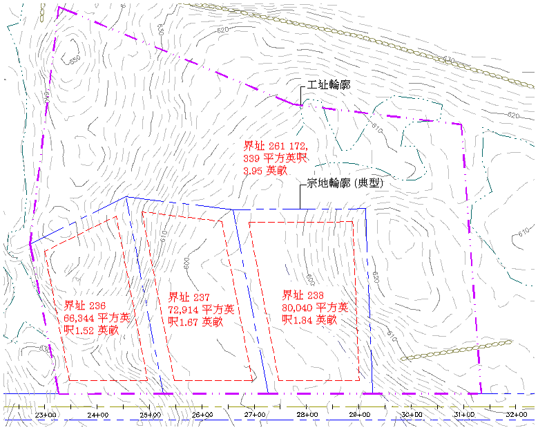 工址宗地具有面積標示,可以隱藏或展示面積標示。您可以控制工址宗地邊界線的顏色和線型,還可以控制該工址宗地邊界線相對於它所封閉的宗地邊界線的繪製順序。