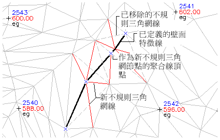 使用「加入特徵線」對話方塊可以將圖徵 (例如檔土牆或路緣) 定義為特徵線。