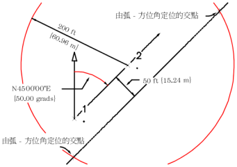 交點位於以點 2 為中心且半徑為 200 的弧,與從點 1 繪製的方位角為 50.0000、向右偏移距離 50 的直線相交處。