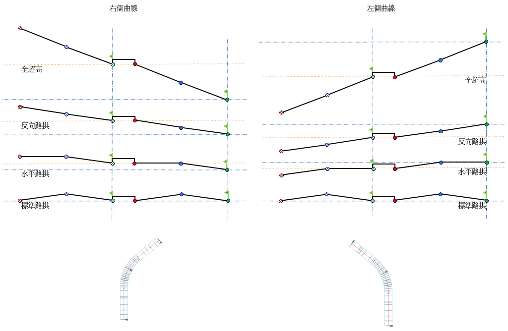 「保持中央造型」意味著當套用超高時,中央將會升高以容納超高。此選項會保持中央造型,而 樞軸點會升高或降低。