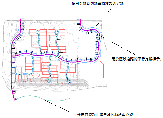 定線物件可代表道路中心線、管網及其他建構基準線。建立和定義水平定線是道路、鐵路或工址設計的首要步驟之一。您可以將定線幾何圖形繪製為聚合線,然後從該幾何圖形建立具名定線。為了更好地控制,您可以使用「定線配置工具」建立定線物件。還可以使用掣點或「定線配置工具」工具列上的指令來編輯定線,同時自動保持定線元件之間相切。