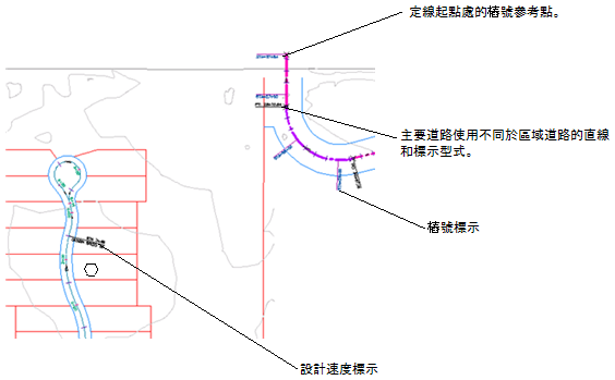 可以透過型式來控制定線元件和標示的視覺外觀。可以建立特定的型式,以用於專案的不同階段。建立定線時,需要指定定線物件的型式和定線標示的型式。在「定線標示」對話方塊中,您可以為定線標示建立型式群組,然後將這些標示儲存成標示集,以便與其他定線搭配使用。