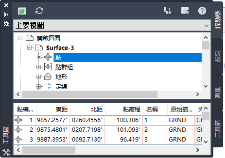 「工具區」視窗是使用者介面中不可或缺的組成部分,用於存取指令、型式和資料。可讓您存取「探勘器」、「設定」、「測量」和「工具箱」頁籤。在這些頁籤上的每個集合或項目上按一下右鍵即可存取指令。