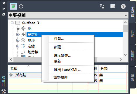 使用「設定」頁籤可以管理物件設定、型式和其他圖面項目,例如點檔案格式、描述碼集和整地準則集。