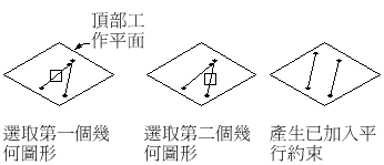 零件建置器提供了十種幾何約束。以下清單描述了這些約束以及可以使用這些約束的圖徵。