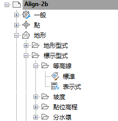 可以編輯位於圖面層級、物件層級 (例如地形) 和標示型式類型層級 (例如等高線) 的標示設定。