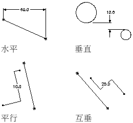 可以用於所有類型的成對幾何圖形定義。定義兩個圖徵之間的值。距離標註的值不能為負數。在兩條直線之間加入距離標註,意味著這兩條直線與給定的分隔平行。
