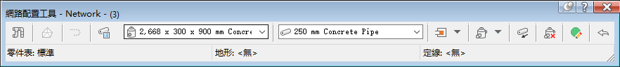 目前選取的管網中參考的零件表名稱、地形名稱和定線名稱顯示在此工具列的底部。