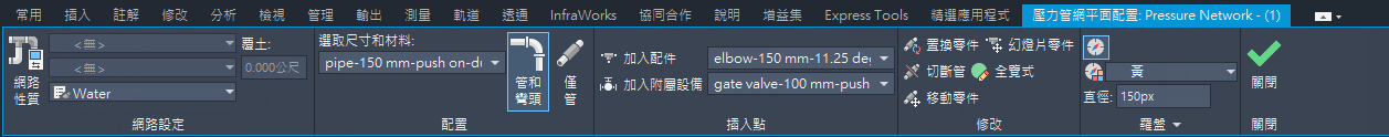 - 按一下「確定」以顯示「壓力管網平面配置」功能區。
