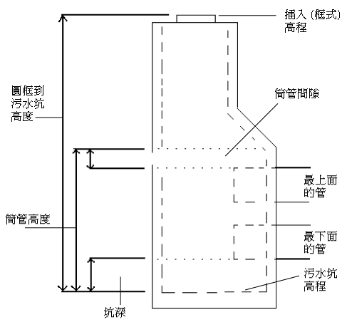 污水坑和坑深。污水坑是指連接器結構內側上的底部區域或小室,例如集水井。污水坑區域有時用作收集垃圾的儲藏所。坑深是指從結構內側底部到與其連接的所有管的最低仰拱之間的距離。特定類型結構的坑深可以根據設計需求而不同。通常,人孔沒有坑深。