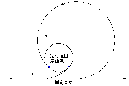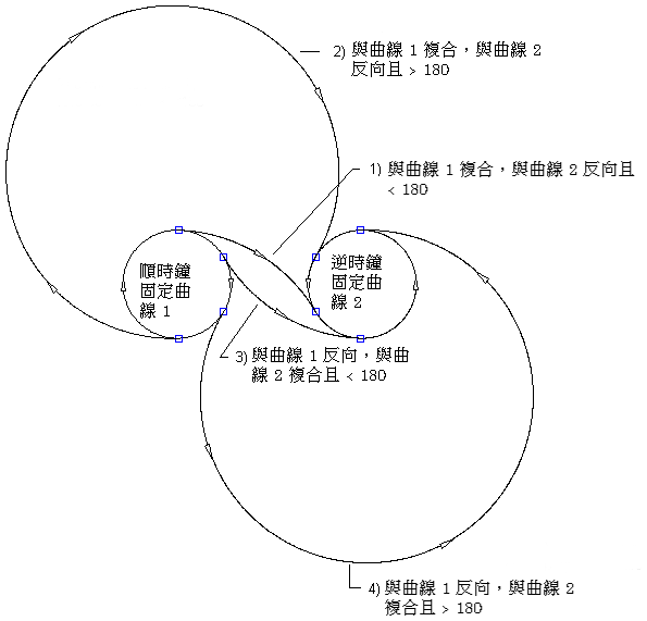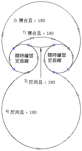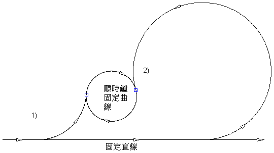 下圖展示了固定順時鐘曲線與固定逆時鐘曲線之間的自由曲線圓角: