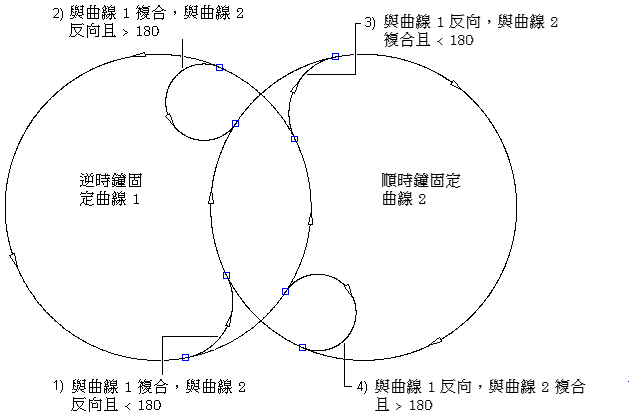 下圖展示了重疊的順時鐘曲線與逆時鐘曲線之間的自由曲線圓角: