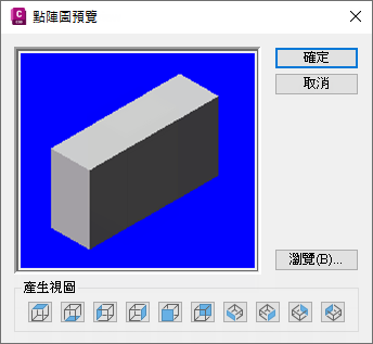 使用此程序可以產生零件的預覽影像,以在選取零件時為您提供幫助。零件建置器根據指定的視圖方向產生預覽影像。您可以從十個標準 AutoCAD 視圖方向中選取,以檢視模型 (上、下、左、右、前、後、西南等角、東南等角、東北等角和西北等角)。