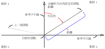 下圖說明了「圖形方向角距離」指令: