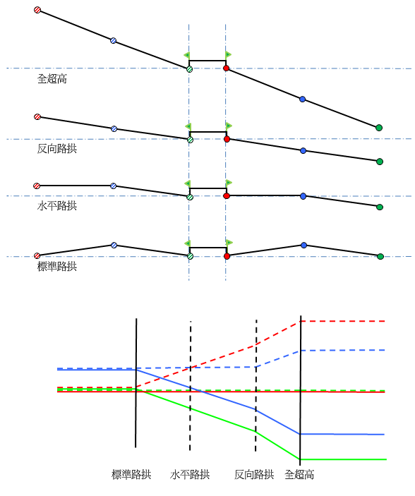 每種情況的典型超高視圖。超高視圖中的彩色線和虛線,其對應於斷面中的圓點。