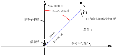 可以透過在象限 1 (NE) 中距離具有描述 PT 的儀器點 100 英呎處旋轉方向角 45°0'0" (50 百分度) 來定位點 2。