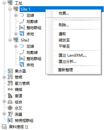 透過在「探勘器」樹狀目錄中的具名的工址集合節點 (例如「工址 1」) 上按一下右鍵,可以存取這些性質。
