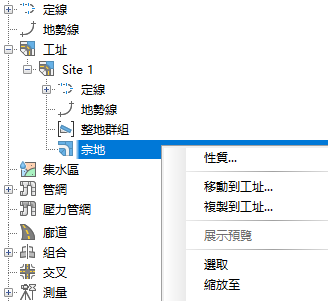透過在具名工址集合下的「宗地」集合上按一下右鍵,可以存取這些性質。
