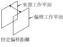 建立從選取的來源工作平面偏移指定距離的工作平面。若要取得更多資訊,請參閱以下的偏移工作平面。